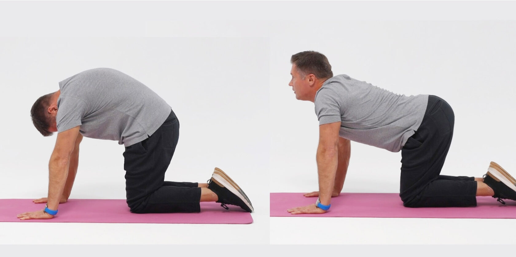 Встаньте на четвереньки: колени — под тазом, ладони — строго под плечами. Сделайте глубокий вдох и плавно выгните спину вверх, опустив голову вниз («кошка»). На выдохе прогнитесь в пояснице, поднимите подбородок и слегка направьте взгляд вверх («корова»).