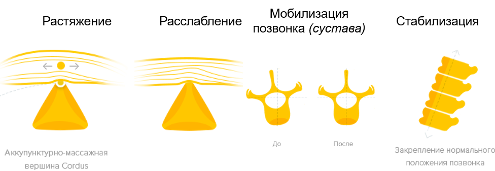 Принцип работы аппарата CORDUS построен на четырёх основах мануальной терапии: